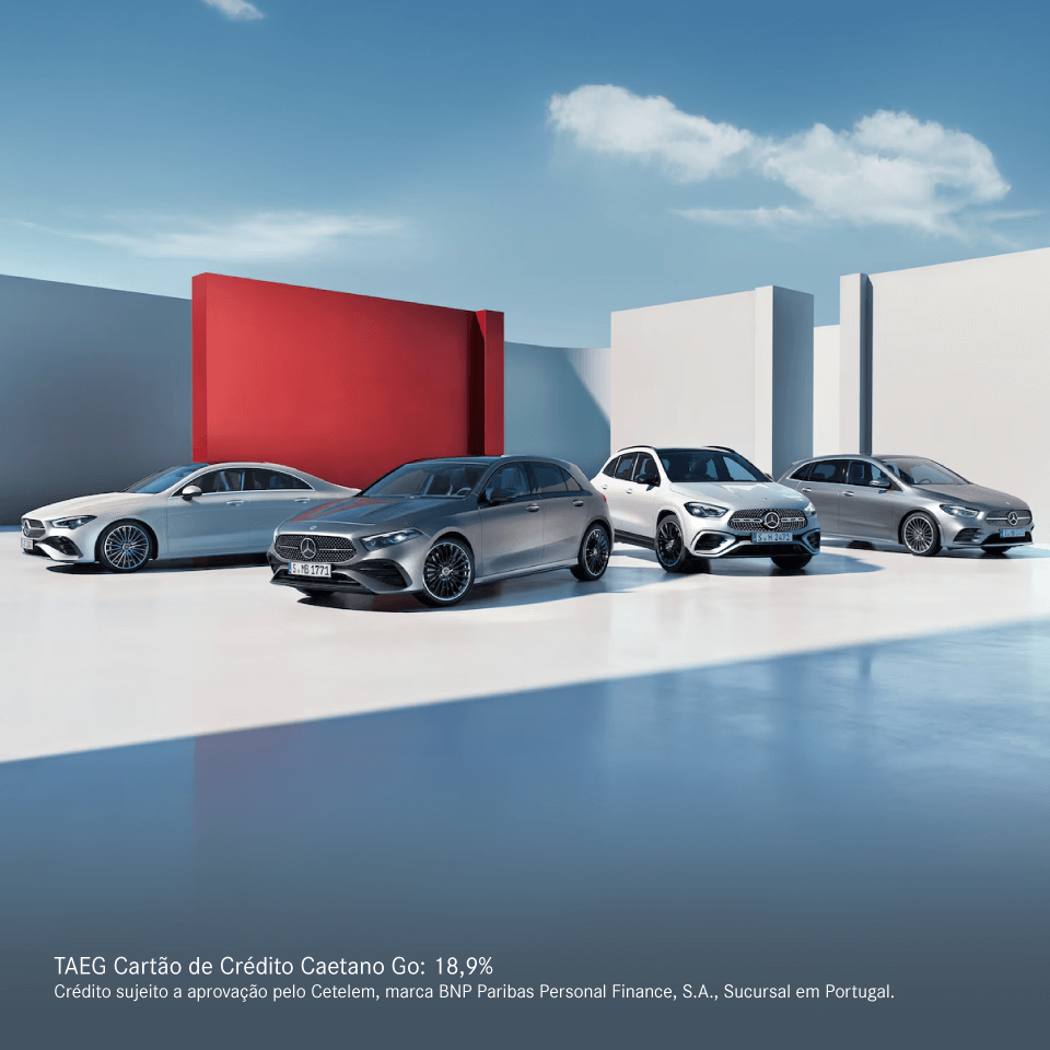 1 O valor é válido até 60 meses após a data da fatura de venda. Campanha válida até 31/03/2026 para clientes particulares na compra de viatura nova ou abrangida pelo programa Mercedes-Benz Certified. Exclui renting e ALD Operacional. Não acumulável com outras campanhas. O valor disponibilizado no Cartão de Crédito Caetano Go apenas pode ser utilizado nas oficinais autorizadas Caetano.